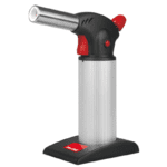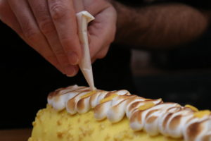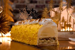 Dresse la meringue italienne sur le dessus de la bûche à l’aide d’une douille Saint-Honoré ou douille feuille puis dore-la au chalumeau.