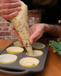 Astuce du chef : tu peux utiliser une cuillère à glace pour bien doser la pâte et la verser proprement dans les caissettes.